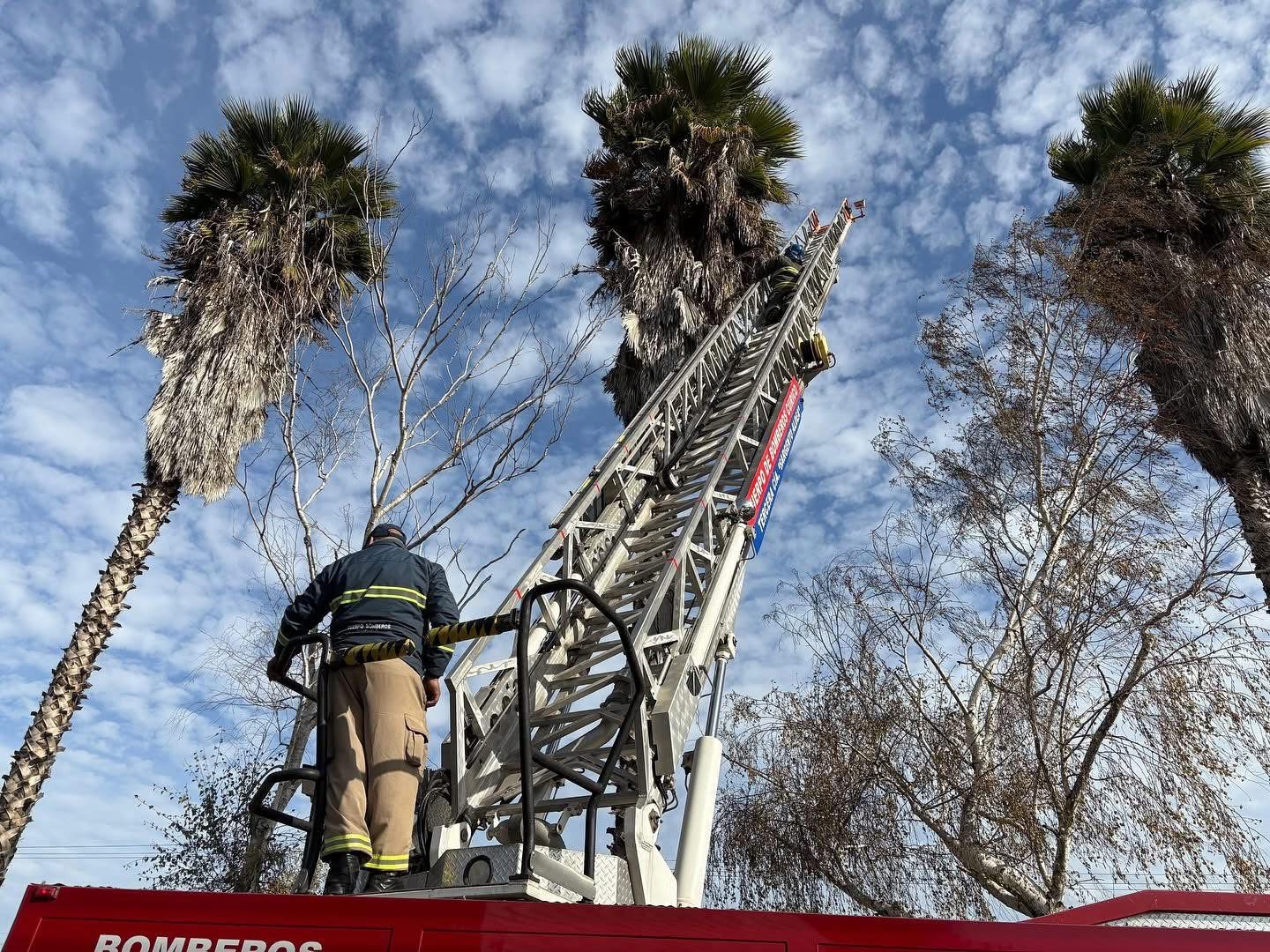 Como bomberos de la comuna no tenia los medios necesarios se pidió ayuda a bomberos de Curicó con su escala telescópica oara su rescate, pero al subir a la palmera el gatito ya no está.