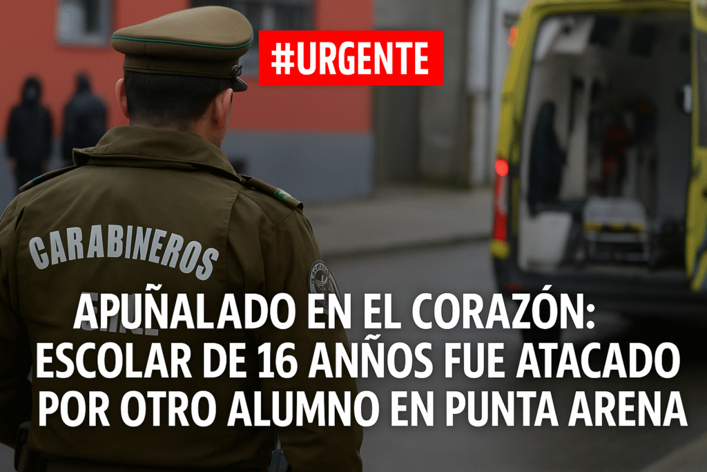 Un estudiante de 16 años, del Liceo Pedro Pablo Lemaitre en Punta Arenas, sufrió una puñalada que le perforó el corazón durante la hora de colación, propinada por otro adolescente de 17 años, alumno de un colegio vecino .