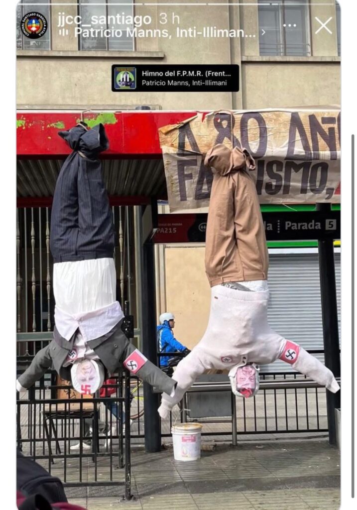 La alcaldesa de Providencia y actual candidata presidencial, Evelyn Matthei, expresó su enérgico rechazo a una publicación realizada por las Juventudes Comunistas (JJ.CC.), donde aparecían muñecos colgados que representaban a los políticos José Antonio Kast y Johannes Kaiser.